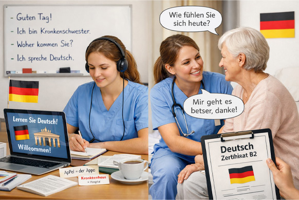 B1 – Intermediate: Workplace communication, patient care conversations, understanding instructions and medical basics